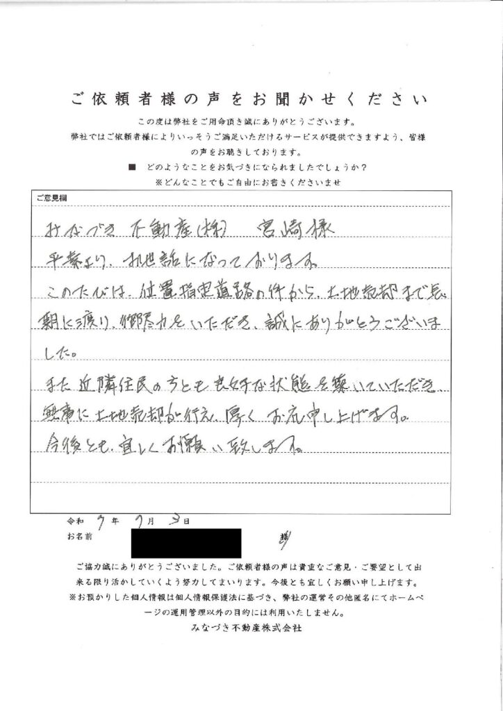 マンション売却・和光市50代男性・ご依頼者様の声を追加いたしました。 公開日:2025年3月6日 新着情報 叔母から話され相続したマンションの売買を行って頂きありがとうございました。 この間こまめにメール、電話で連絡を頂き安心してました。また金額も納得したところで決めて頂きました。 ありがとうございました。 関連記事 (専任)和光市下新倉五丁目土地(138.91㎡)成約致しました。松⼾市松⼾新⽥土地2280万円成約しました。板橋区前野町6丁目 戸建(※再建築不可 1500万円)成約しました。ご依頼者様の声⑤を追加しました。(専任)杉並区上井草コンドミニアム成約致しました。(専任)東久留米幸町2丁目土地(127.02㎡)ご満足の成約しました。 投稿ナビゲーション 川越市川鶴土地2730万円 成約しました。いつも誠にありがとうございます。2025年4月29日(火)~2025年5月6日(火)まで休業のお知らせ
